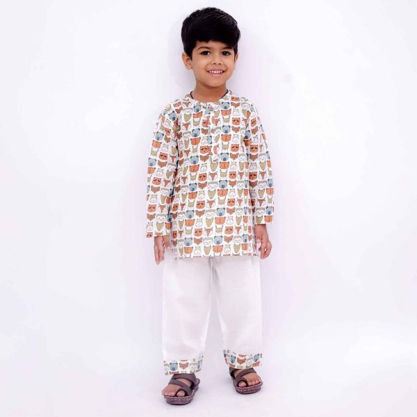 Unisex Animal Face Print Kurta Pajama Nightsuit is made from cotton. The outfit is soft on the skin and breathable. It helps keep your child comfortable even during long hours of wear, making it ideal for festive or family occasions.