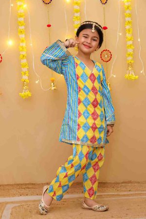 Brighten up your princess’s day with this Blue Yellow Bandhani Salwar Kurta Co ord Set. It is made from soft and breathable cotton. This salwar suit keeps your princess comfy all day. The ¾ sleeves kurta features a beautiful bandhani print which adds a touch of tradition. It is paired with a matching salwar. This set is perfect for festive celebrations, family gatherings, or casual outings.