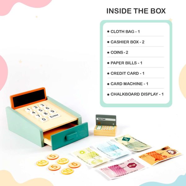 | Includes | 1 Cloth Bag, 1 Cashier Box, 6 Coins, 5 Paper Bills, 1 Credit Card, 1 Card Machine, 1 Chalkboard Display. |