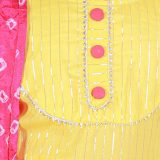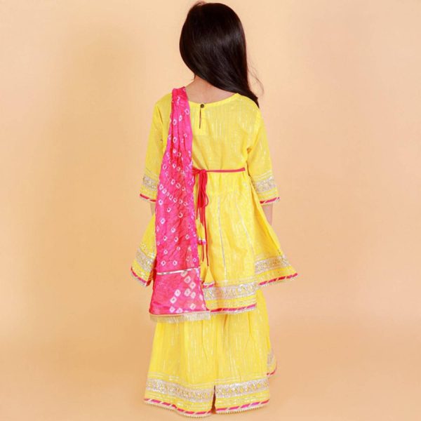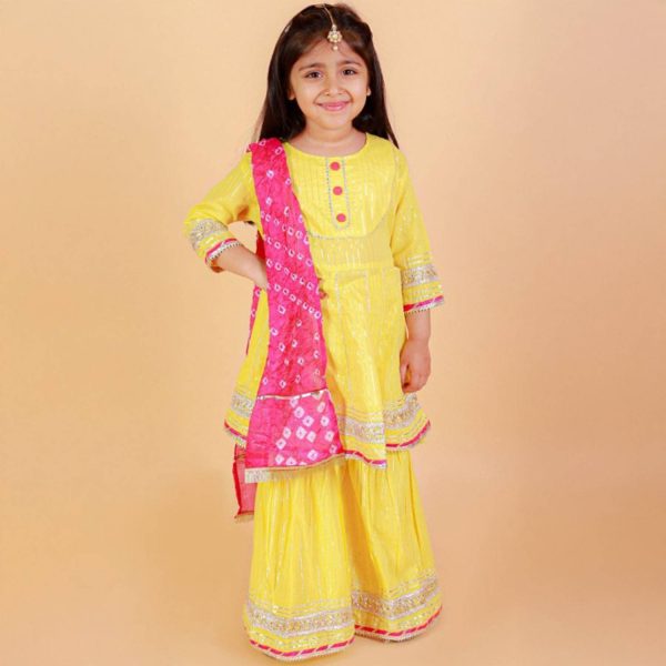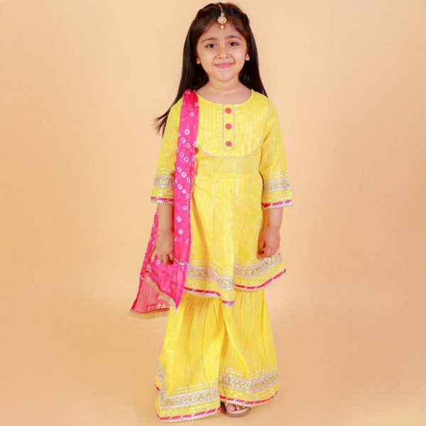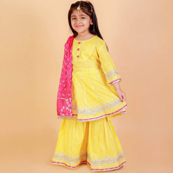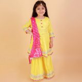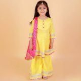 Upgrade your little one’s wardrobe with the Top Sharara Set with Dupatt. It is a perfect blend of style and comfort. This set features a beautifully crafted yellow top, paired with a graceful sharara and a pink dupatta, making it ideal for festive occasions and family events. Kids’ sharara are made from soft, breathable fabric.