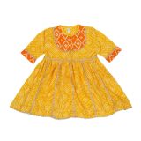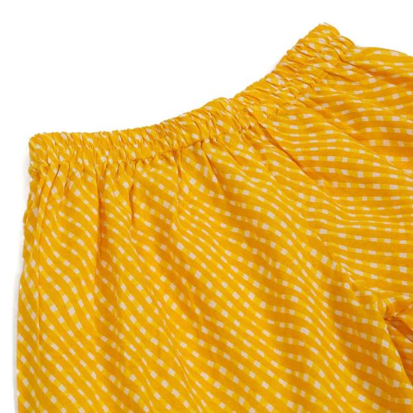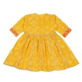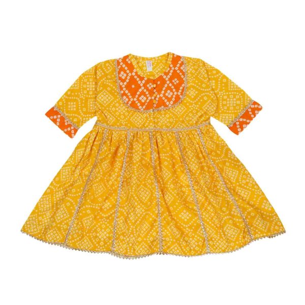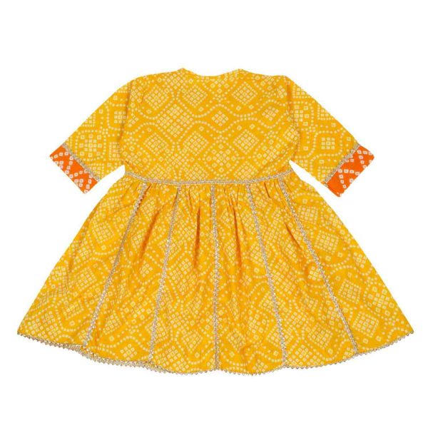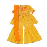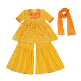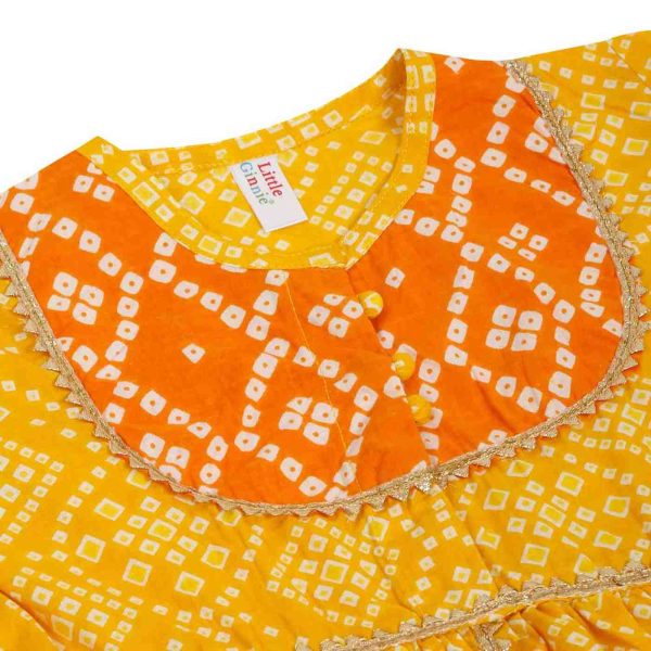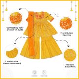 Yellow Bandhani Sharara Set is perfect to adorn your little princess for any festive occasion. The sharara dress for baby girl features a mesmerizing Bandhani print, adding a touch of vibrant charm. Crafted from soft and breathable cotton, it ensures utmost comfort and effortless movement.