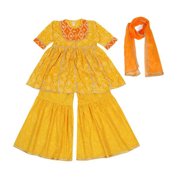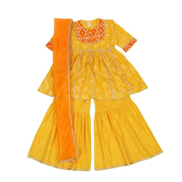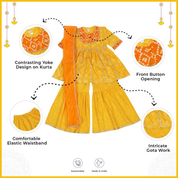 Here are the product specifications for the Yellow Bandhani Sharara Set.
